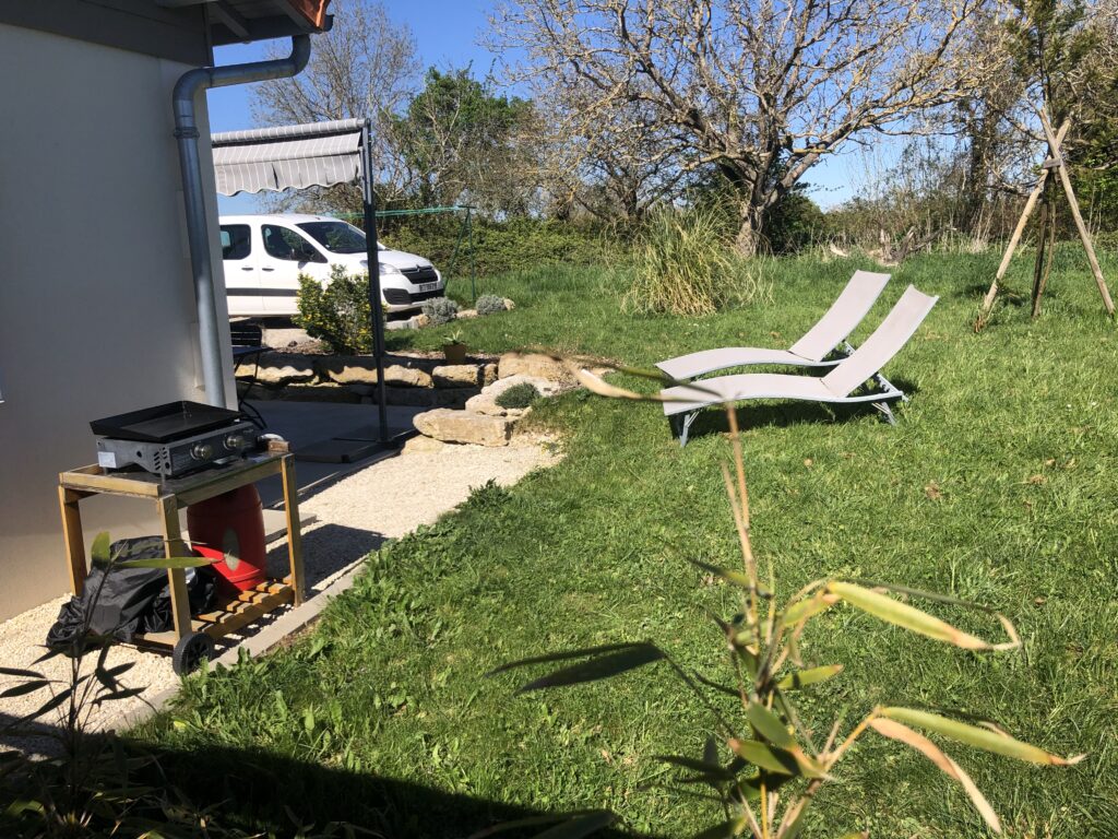 Extérieur : terrasse ensoleillée de 14 m² privative équipé d’un salon de jardin, chaises longues transat, parasol, barnum, plancha.